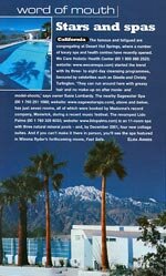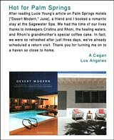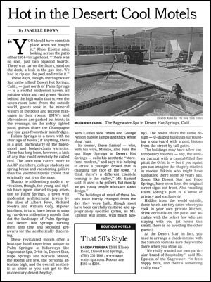 | "Look and Feel: The scent of sage permeates the air around this cool, mid-centure modern motel. Seven cozy studios with kitchenettes form a J-shape around Sagewater's centerpiece a mineral spring fed pool filled with silky water. The only reason to leave its sensuous embrace is a spa treatment in the privacy of your own room. Desert light positively glows in this chic, streamlined retreat even as the sun sets over the nearby mountains."